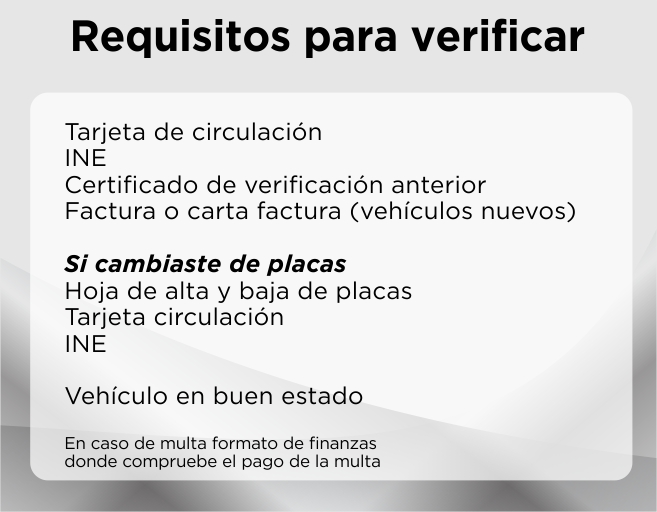 Recuerda que además de los requisitos documentales para poder verificar, es necesario traer tu vehículo en condiciones adecuadas para solventar la prueba, ya que además de inspección de emisiones se somete a inspecciones visuales por parte de nuestro personal.